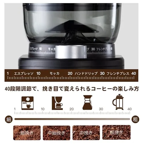 【精密40段階調整で飲み方自由自在】エスプレッソ用の極細挽きからフレンチプレス向け粗挽きまで、プロが認める40段階微調整機能。豆の品種や焙煎度に合わせた最適な粉粒度を実現し、お好みの抽出法(ペーパードリップ/サイフォン/エアロプレス等)全てに対応します。