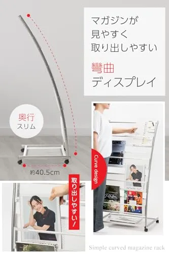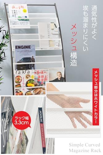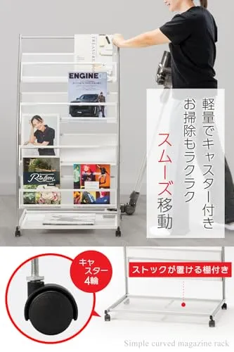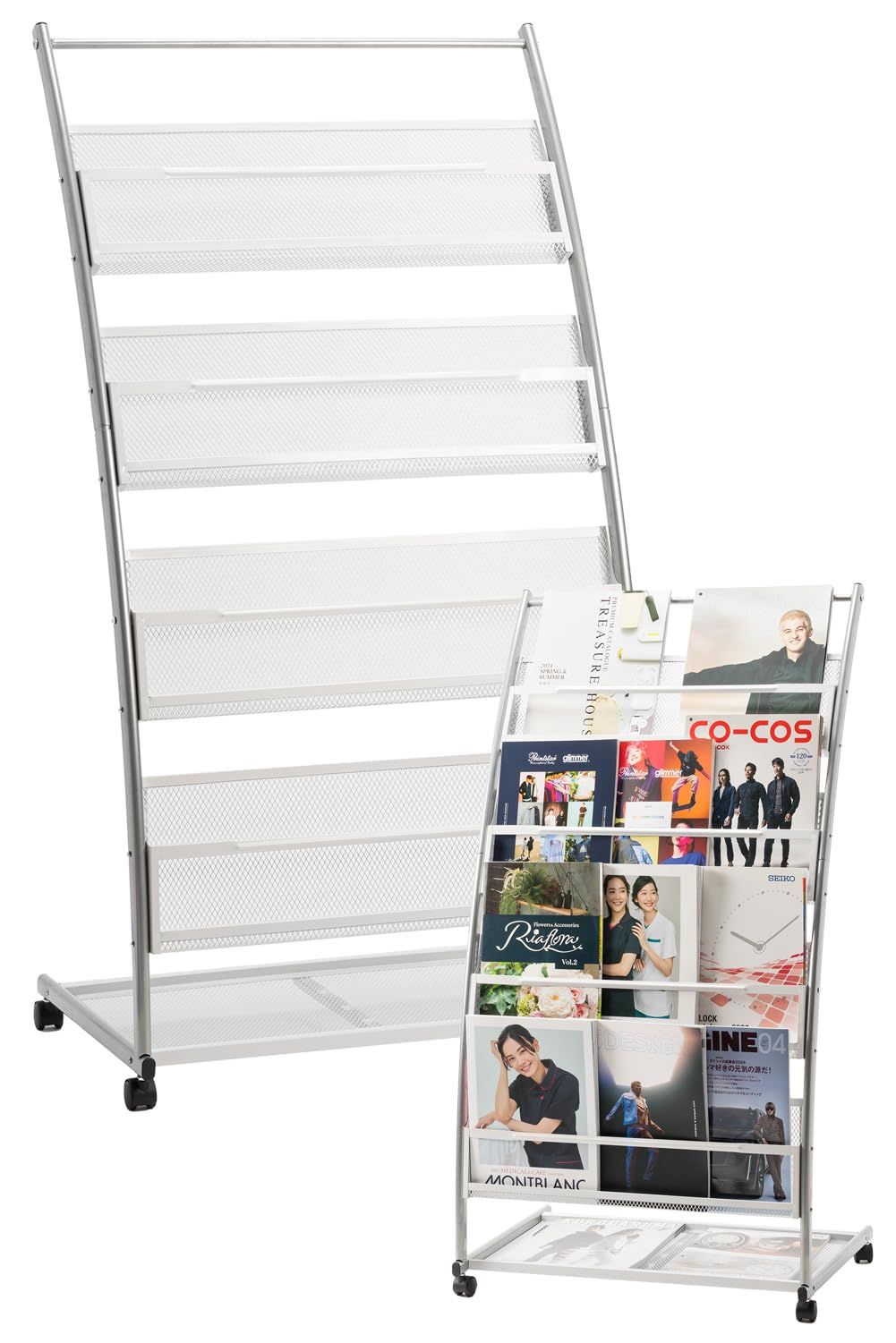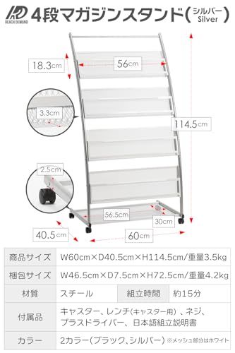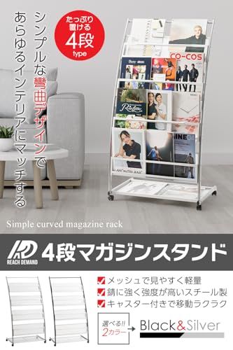 D★マガジンスタンド【正規品】4段 幅広 キャスター付 湾曲ディスプレイ 軽量 スチール製 メッシュ構造 雑誌ラック ブック パンフレット ディスプレイ棚 スリム 収納 オフィス 店舗 家庭用 ロビー サロン カフェ 展示会場 イベント 待合室 (シルバー)