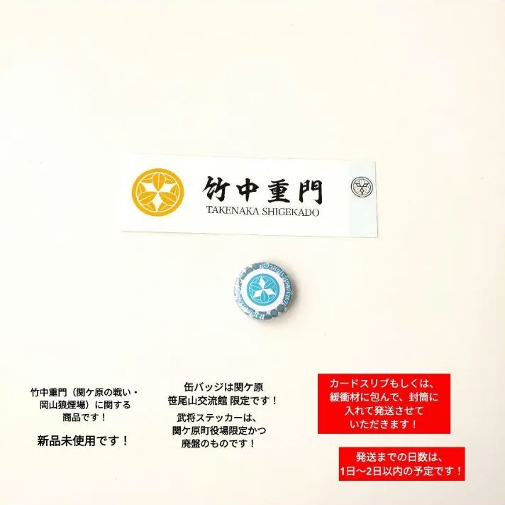 【関ヶ原の戦い】 【天下分け目の戦い】 【関ケ原町役場】 【笹尾山交流館】 東軍 竹中重門 武将シール 缶バッジ セット