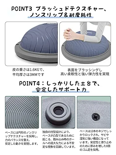 【安定性抜群 安全防爆裂】3mm厚めがあるボールの壁と耐摩損なPVCスタンドと6本厚いの足座により、ボールが力を均等に受け、ベースが安定で、ベースの内部が独特な凹面デザインを採用し、力入れて踏み込むことによる不安定現象を避け、バランスボード筋トレしっかりとしたサポート
