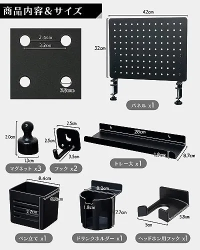 【寸法】商品画像6枚目をご確認ください。 商品内容:・ペグボード1・マグネット3・フック2・トレー大1・ペン立て1・ドリンクホルダー1・ヘッドホン用フック 材質 スチール:パネル、フック、トレー大 / ABS樹脂:ペン立て、ドリンクホルダー、ヘッドホン用フック