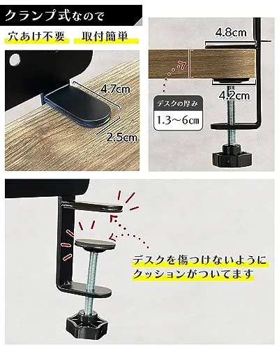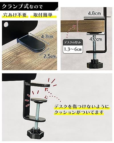 【配線整理としても】ペグボードをデスク下に取り付け、付属フックや付属トレーを活用することによりケーブルオーガナイザーとしても使用いただけます。 デスクを傷つけない設計:クランプ式の為、デスクに穴をあける必要はありません。デスクに挟み込めばOKです。またデスクを傷つけないように、デスクを挟む箇所にはクッションがついてます。 対応デスクの厚み:1.36