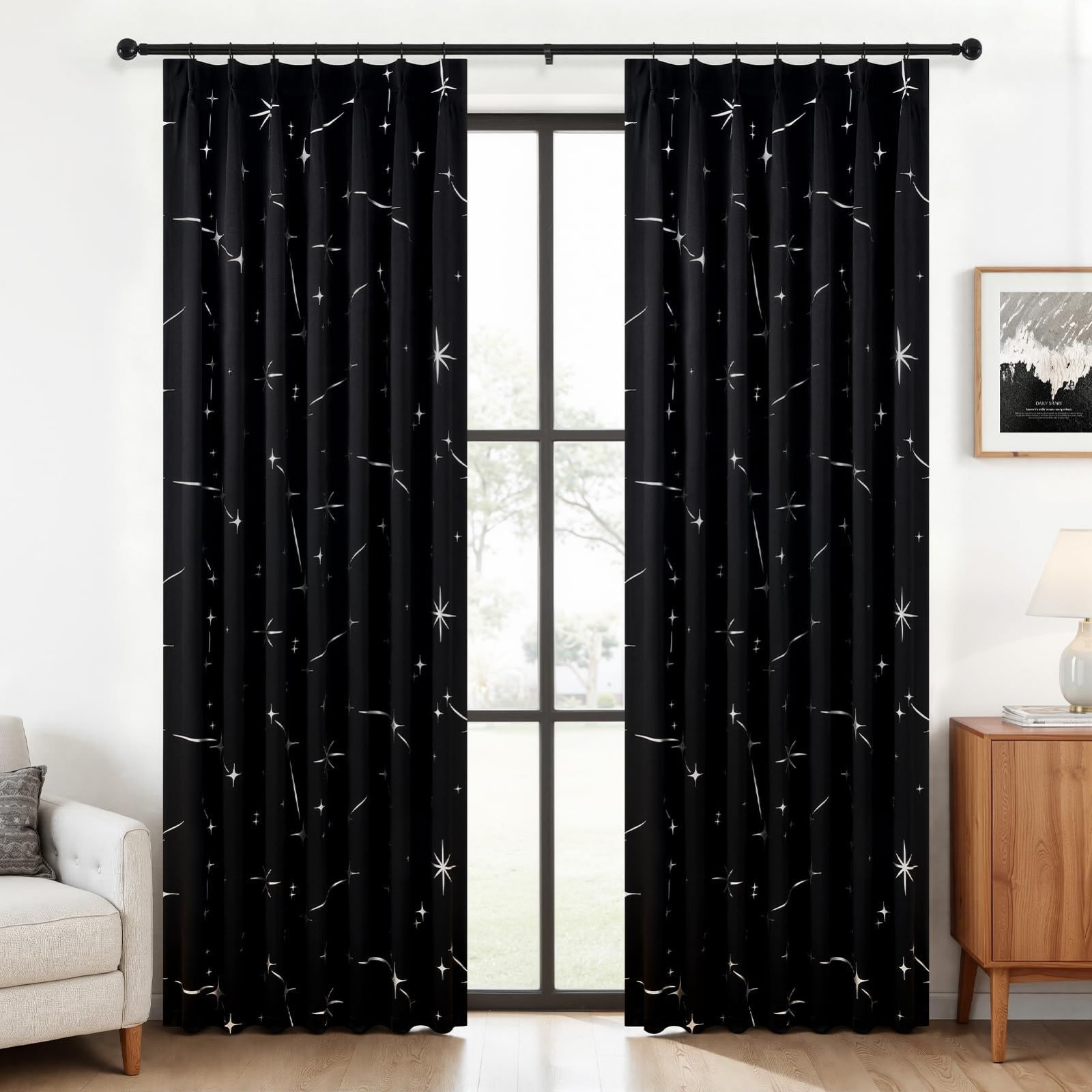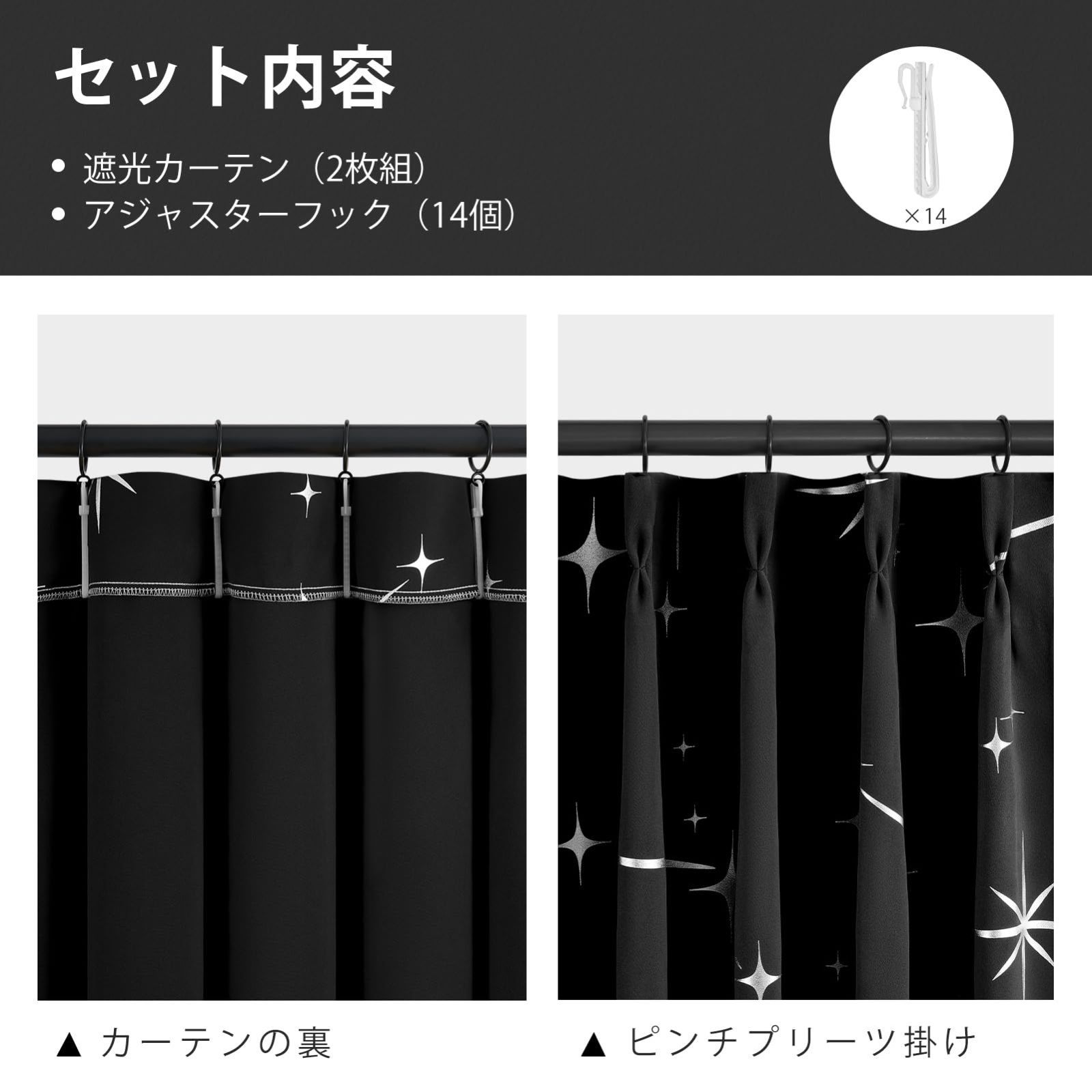 Topfinel カーテン 遮光 断熱 星柄 箔プリント 遮光カーテン 110cm丈 2枚組 ブラック フック付き 寝室用 リビング 省エネ 目隠し 防音 間仕切り