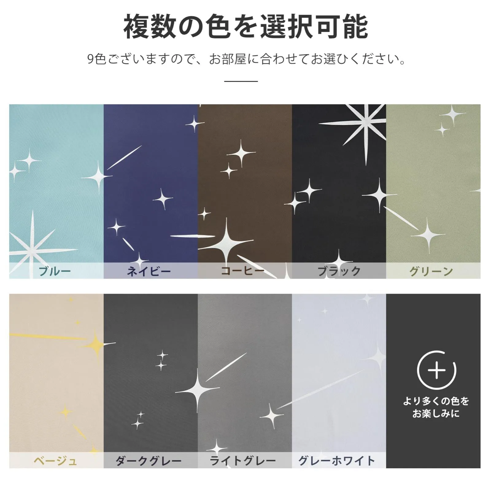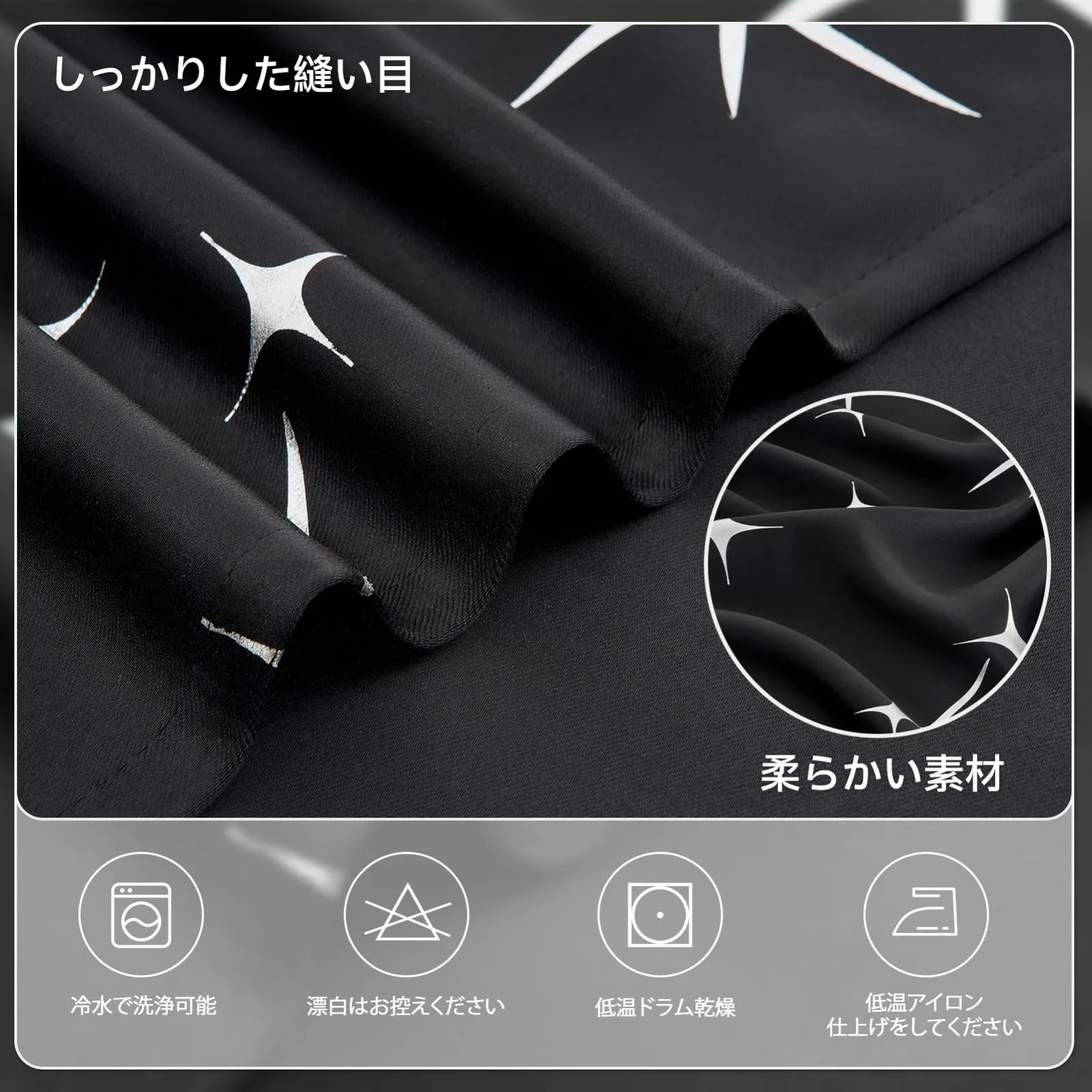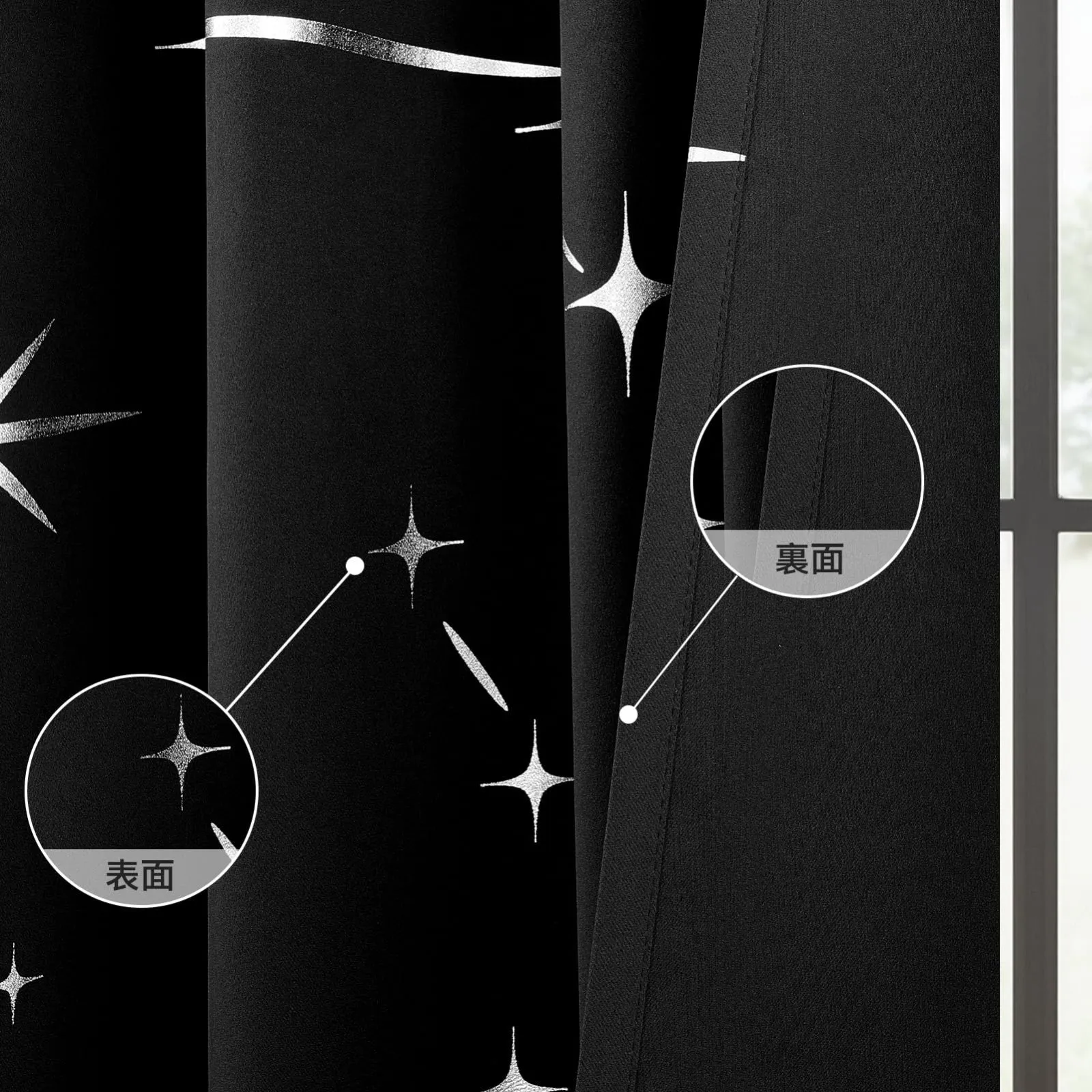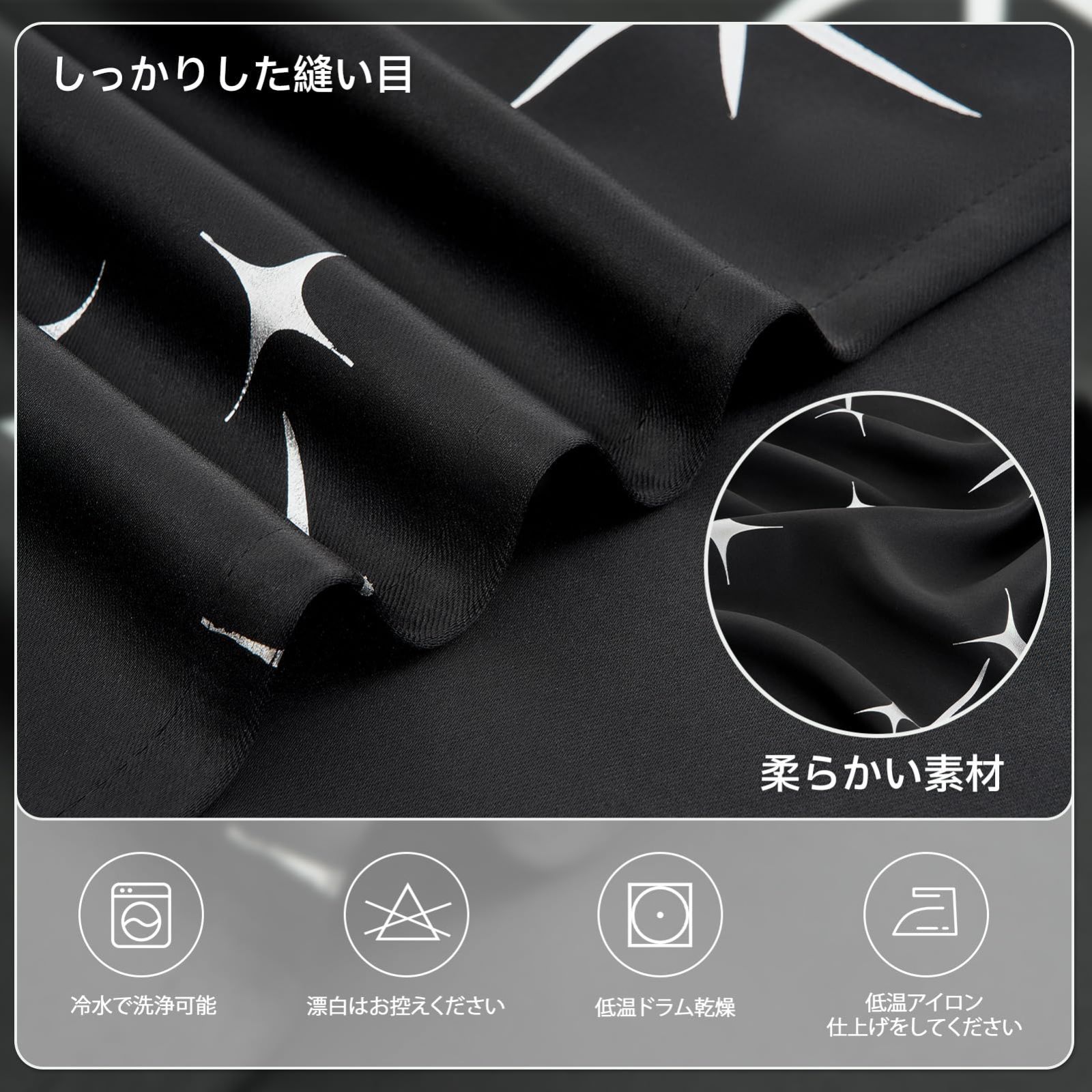 【デザイン】:箔プリントで星柄が綺麗なカーテン。光の当たり具合により箔プリントがキラキラ光って見えます。シンプルでユニークなデザインは、退屈することなく、いつでも楽しむことができます。
