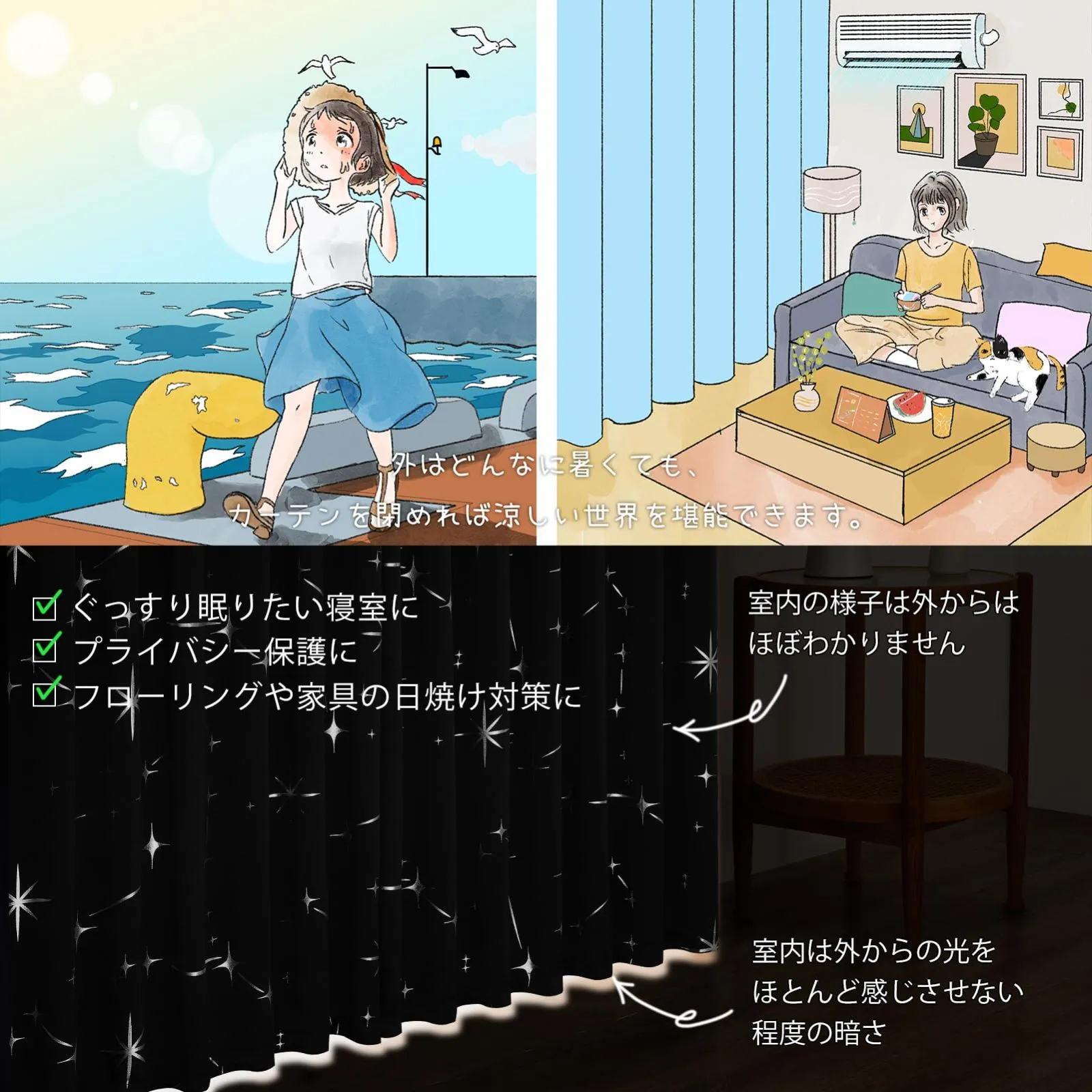 【遮光機能】:遮光カーテン、光と紫外線の85%-99.9%を妨げます、断熱・防寒、光を気にせず朝までぐっすり眠れます。目隠しカーテン、外からの視線も防ぎ、プライバシーを保護できます。