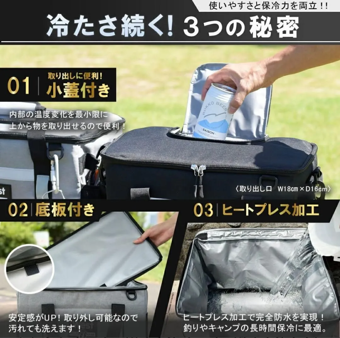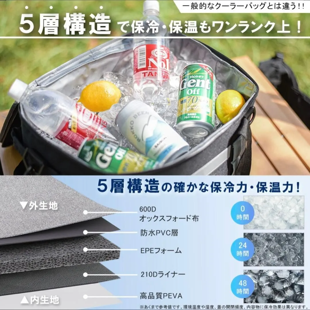 【5層構造×防水設計】 ・600Dオックスフォード防水生地を表層に採用し、PP板・EPE・不織布・PEVAを緻密に積層。5層構造が外気の影響を徹底遮断し、氷の溶けにくさは市販品の1.5倍以上。 ・表面は耐摩耗性に優れ、内部は環境に優しく抗菌でありながら、特殊ホッとプレス技術により縫い目ゼロ設計を実現、24時間水浸しテストでも完全防水を証明。保冷剤を入れた状態で長時間の低温維持が可能なため、釣り・キャンプでの生鮮食品保管に最適です。