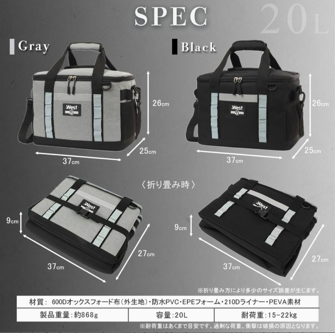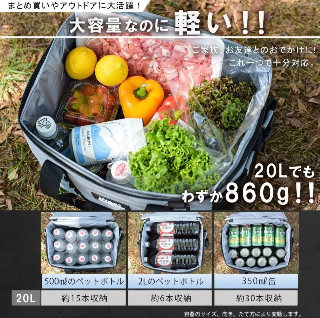 ソフトクーラーボックス 保冷バッグ 20L グレー 底板付き 軽量 大容量