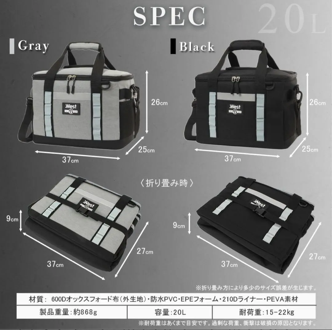 【商品情報】 ・カラー:グレー ・素材 外生地600Dオックスフォード 中生地防水PVC EPEフォーム 210Dライナー 裏地PEVA素材 ・容量 : 20L ・耐荷重 : 15~20kg ・サイズ : 高さ26cm 幅37cm 奥行25cm ・重量 : 860g ✳︎ソフトクーラーボックス20L✳︎