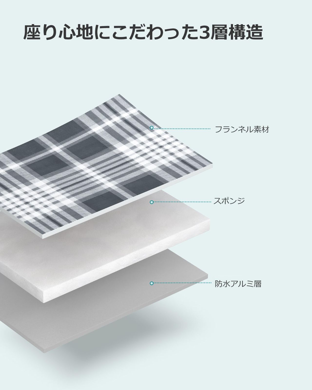 【座り心地にこだわった3層構造】3層構造で地面のゴツゴツ感を和らげてくれ、長い時間座ってもお尻も痛くなりません。厚手の生地なので、座った時の冷たさや暑さなどを緩和してくれて、優しい座り心地で快適です