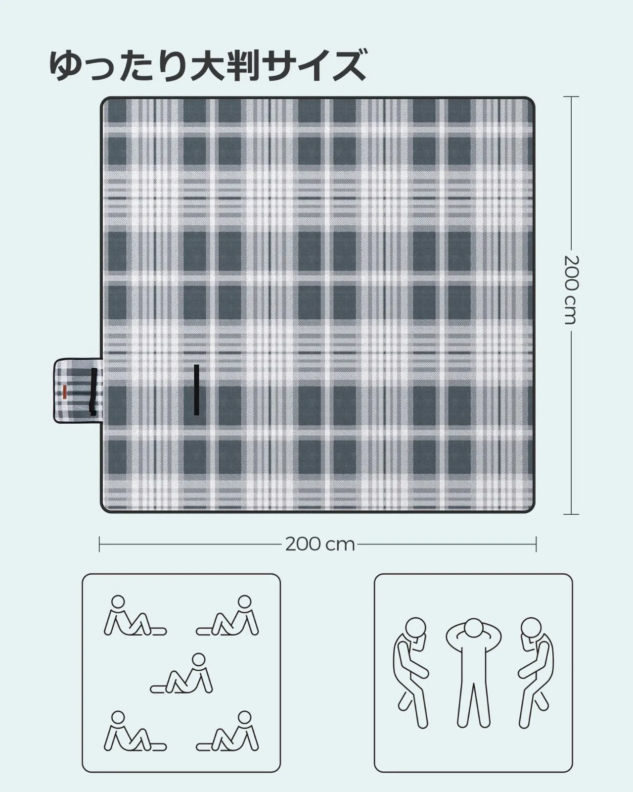 【大きいサイズでゆったり】お客様の使用願望に応える195×150cmと200×200cm二種類のサイズを用意しました。一人用とか、親子の旅とか、人数が多い時のイベントでも快適に過ごせます