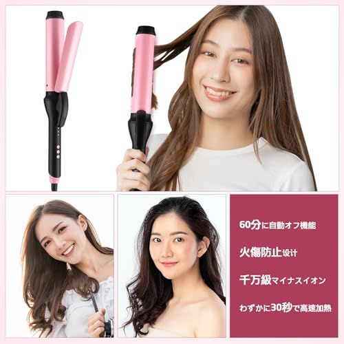 【60分オートオフ】電圧:100V240V、海外で使用可能です。万が一電源を切り忘れた場合でも、約60分後にカールヘアアイロンが自動的にオフになります。
