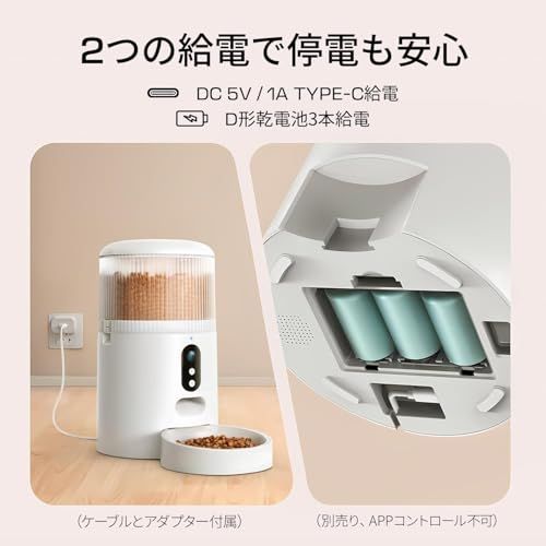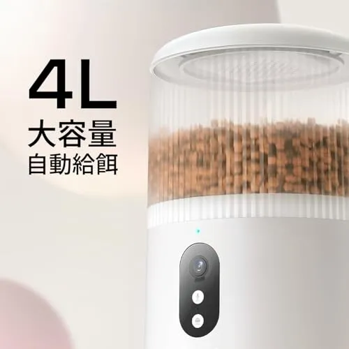 【ご注意】本給餌器はプロペラ回転によりフードを排出します。1回分の給餌量は約5~10グラムですが、実際の排出重量はフードの種類によって異なります。同じフードで毎回安定した量が排出されていれば、機器は正常に動作しています。 「大容量4Lの猫 自動給餌器」 この猫 自動給餌器は、最大4L(約16.9カップ)のドライフードを収納可能。冷凍乾燥フードやエアドライフードにも対応し、内蔵の乾燥剤ポケットがフードの鮮度を保ちます。耐噛性USBケーブルを採用し、停電時には別売りの単一乾電池3本でバックアップ給電が可能。ネットワーク接続が切れた場合や停電時にも、確実に自動給餌を継続します。ご注意: 単1電池で駆動するバックアップ給電モードでは、カメラ機能およびWi-Fi接続機能はご利用いただけません。 「安心のリアルタイム通知機能付き自動給餌器 犬」 動作センサーがペットの動きを感知すると、カメラが録画を開始しスマホに通知が届く自動給餌器 犬です。別売りのSDカード(256GB対応)を使用すれば、録画データの再生・確認が可能。フード残量不足やデバイスのオフライン化など、重要な情報を即時にお知らせするため、愛犬のお世話も安心です。 「双方向通話機能搭載の給餌器 猫」双方向音声通話機能を備えた給餌器 猫です。専用アプリを通じて遠隔からペットに話しかけたり、食事呼び出し機能で愛猫を食事に誘導したりすることができます。給餌スケジュールの設定や給餌履歴の確認もア