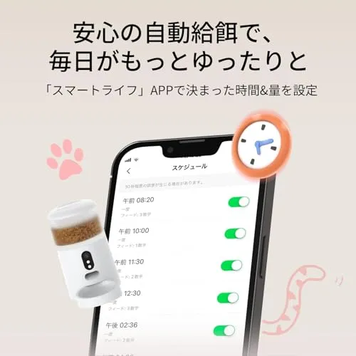 「スマホで簡単操作!猫犬対応 餌やり機」 専用アプリを使用して、自動給餌器 猫に最適な給餌スケジュールを遠隔で簡単に設定・管理できます。1回あたり110回分の調整が可能で、1日最大8回までの給餌に対応。愛猫の体調や生活リズムに合わせた給餌プランを実現し、給餌履歴の確認を通じて健康管理をサポートします。