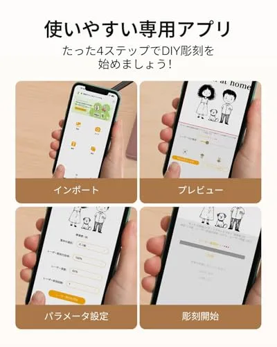 【簡単操作&便利】レーザークラス1、レーザー出力:0.5mW、Laspecker proレーザー刻印機のプロジェクトは構想3年、80台の試作機から生まれました。操作はスマホアプリで簡単にできます!アプリをダンロードした後で、ガイドブックに従って、初心者でも全く心配がありません。アプリはスマホ機種を全部対応します。アプリ使えば、何種類もある中から自分の好きなデザインを選ぶだけ、もしくはあなたがデザインしたデザインや思い出の写真をアップロードして使うこともできます。