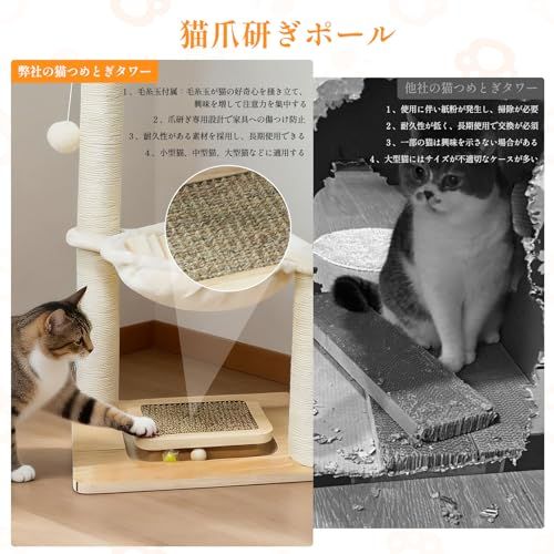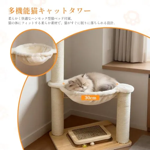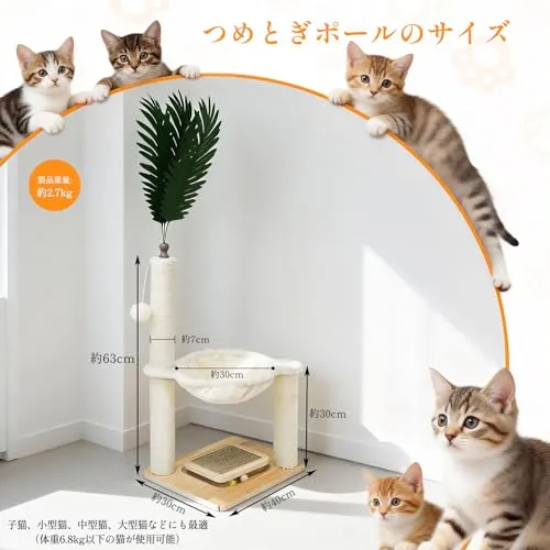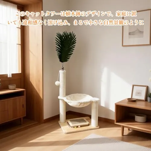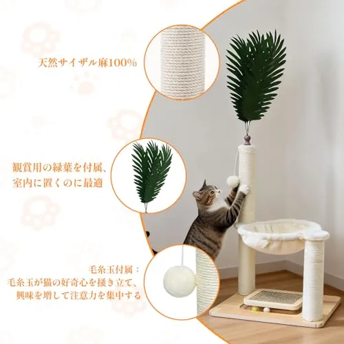 【1m 高縦型設計・多機能猫つめとぎタワー】この猫つめとぎタワーは全長 1m の縦型猫タワーです!天然麻縄を巻いた極太爪研ぎポールと猫ベッドが一体となったデザインで、猫の爪磨き本能と休憩ニーズを同時に満たします。上には着脱可能なシミュレーション葉があり、室内装飾にも最適です。