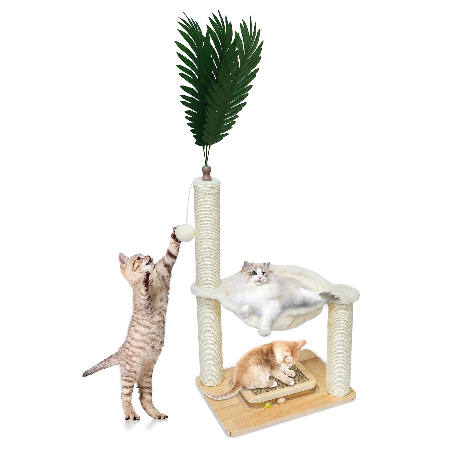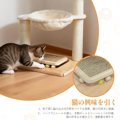 【猫の好奇心をくすぐるアクセサリー】この猫つめとぎタワーは猫じゃらし付き、猫の好奇心を引きます、猫の爪が毛玉を掻きまわす、とても面白いデザインです。台座に三つのボールが付いています、2 つは木製ボール、1 つは鈴を内蔵したボールで、3 つのボールが軌道の中を動きます。猫は動くボールに非常に興味を持ち、狩猟本能を刺激して爪でボールを掻いて遊びます。ボールが外に飛び出す心配がなく、安全で楽しい仕組みになっています。