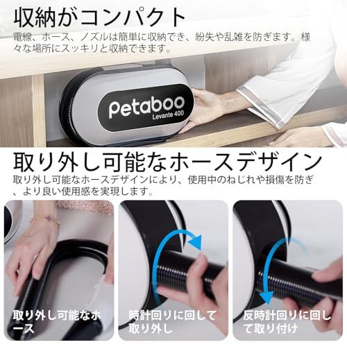 【3 in 1 & 簡単収納】Petabooヘアドライヤーには、さまざまなペットの毛の種類に合わせて、丸型、平型、幅広の櫛型ノズルが装備されています。コンパクトなデザインなので、どこにでも簡単に収納して置くことができます。さらに、取り外し可能なホースにより耐久性が向上し、使用中に方向を調整できる柔軟性があります。