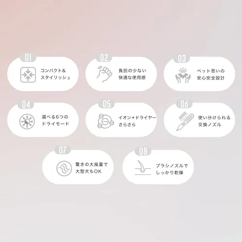 最大時、小型ながら毎秒18mのパワフルな風がペットの毛の根元まで届き、短時間でしっかりとしたドライを実現。片手ですぐに乾かせるから、肌への負担はもちろん、飼い主さまの負担を少しでも抑えることが可能です。