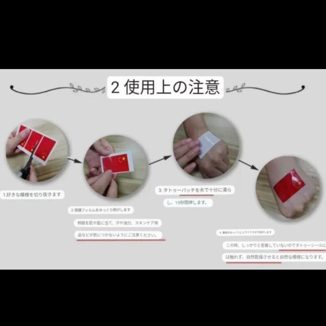 【貼り方】 1. 保護フィルムをゆっくり剥がします ※汗・油分はふき取ってから貼ってください 2. タトゥー面を肌にのせ、水でたっぷり湿らせて15秒押さえます 3. 裏紙を優しくスライドしてはがし、自然乾燥で完成!