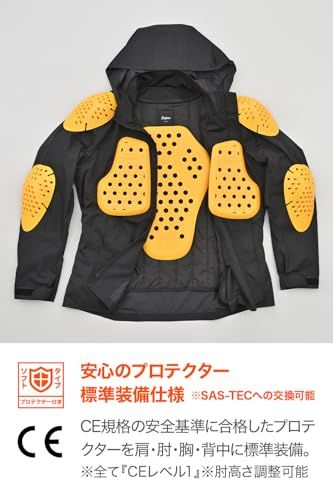 胸、ひじ、肩、背中にCE取得ソフトプロテクター標準装備。ひじは高さ調整可能。