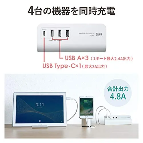 4ポート合計で最大4.8Aまでの出力に対応しており、最大4台の機器まで同時に充電することができます。