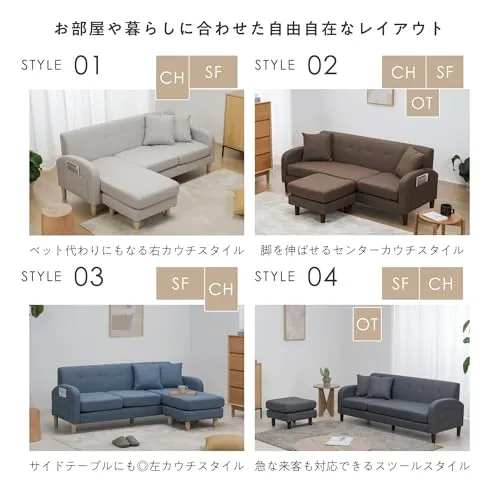【自由自在なレイアウト】お部屋の雰囲気やスペースに合わせて、右カウチ、センターカウチ、左カウチ、スツールタイプといった多彩なレイアウトが可能。日々の気分やライフスタイルに合わせて、簡単に模様替えを楽しめるデザインにしました。