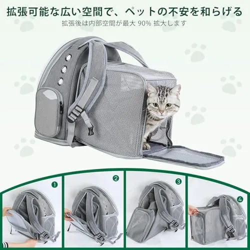 1.拡張設計でゆったり空間を確保: 猫リュック・犬リュック兼用の本製品は、リュック型ペットキャリーとして独自の拡張可能構造を搭載し、内部スペースを大幅に拡大でき、猫・小型犬が自由に動き回れます。拡張部分は通風性も向上し、ペットの移動時のストレスや不安を軽減し、旅行・通院・災害避難などのシーンでも快適に過ごせる空間を作り出す、高機能なペットキャリーリュックです。