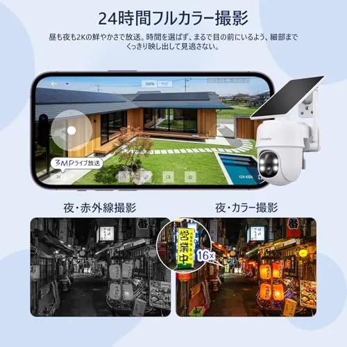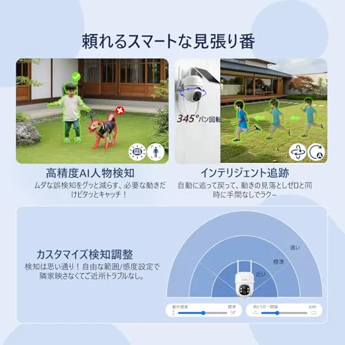 【2K鮮明画質・365日カラー見守り】300万画素の2K高画質で、屋外の細部まではっきり捉えます。真っ暗な夜でも、内蔵LEDが庭を明るく照らすため、別途の庭園灯が一切不要! これ一台で、常にフルカラーの鮮明な映像を実現。水平345度、垂直60度の広角レンズと首振り(PTZ)機能で、庭や玄関全体を死角なく見守ります。