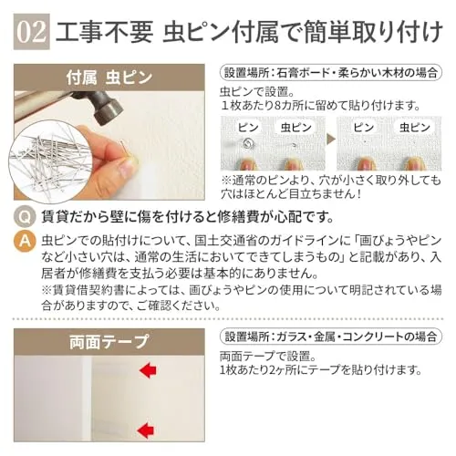 【 虫ピン付属で簡単貼り付け 】貼り付け方法はとても簡単。付属の虫ピンを打ち付けることで、壁や天井にしっかりと固定されます。痕が目立ちにくい虫ピンは、取り外しもスムーズに行えるのでちょっとした模様替えにもおすすめです。別売りの両面テープをマスキングテープの上から貼りつければ、虫ピンを利用せず綺麗に貼りつけることも可能です。