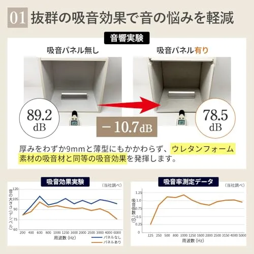【 音響・騒音対策。防音ボックスや防音ブースなどにも 】壁や天井に貼り付けるだけで音響対策になる吸音パネルは、不快な反響音を減少させることで、音量の減少や音声、音楽をクリアに聴くことができます。200kg/m3の高密度に圧縮することで、厚みをわずか9mmと薄型にもかかわらず、ウレタンフォーム素材の吸音材と同等の吸音効果を発揮します。 臭いも無いのでコロナ対策の防音ブースや楽器の練習するための簡易防音室の素材としても最適です。しかも吸音パネルは変色性が無いため、カラーバリエーションを豊富に揃えることが可能となり、壁紙感覚で気軽に利用することができます。