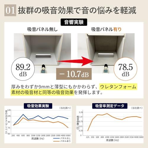 【 音響・騒音対策。防音ボックスや防音ブースなどにも 】壁や天井に貼り付けるだけで音響対策になる吸音パネルは、不快な反響音を減少させることで、音量の減少や音声、音楽をクリアに聴くことができます。200kg/m3の高密度に圧縮することで、厚みをわずか9mmと薄型にもかかわらず、ウレタンフォーム素材の吸音材と同等の吸音効果を発揮します。 臭いも無いのでコロナ対策の防音ブースや楽器の練習するための簡易防音室の素材としても最適です。しかも吸音パネルは変色性が無いため、カラーバリエーションを豊富に揃えることが可能となり、壁紙感覚で気軽に利用することができます。