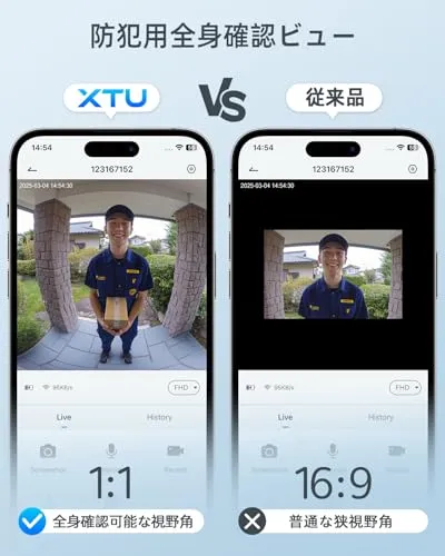 D★インターホン ワイヤレス 工事不要【全身確認可能・2K 180°超広角】 XTU ドアホン カメラ付き ドアベル テレビドアホン スマホ連動 来訪者の頭から足元までしっかり確認 Alexa/Google Home連携 遠隔監視 双方向通話 家族共有 IP6