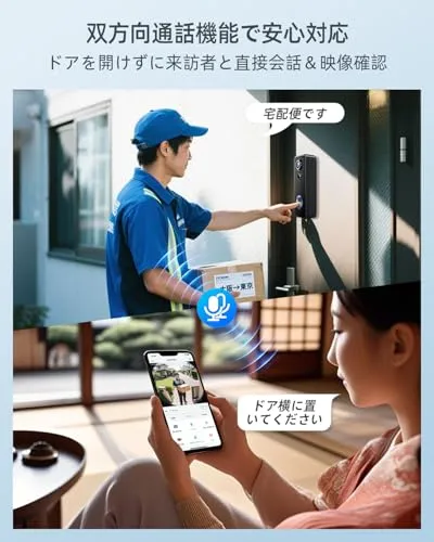 【スマート人間検知&双方向通話】当社のテレビドアホンは先進のPIR人感センサーを搭載し、人間の動きを95%以上の精度で検知し、不要な動物や木の葉の動きなどの誤検知を大幅に削減します。検知範囲は最大5m、専用アプリで検知エリアを自由にカスタマイズできるので、通路や道路側など不要なエリアの通知をオフにすることも可能です。双方向通話機能で、外出先からでも配達員と会話したり、不審者を威嚇したり可能。※接続は2.4GHz Wi-Fi対応(5GHz非対応)