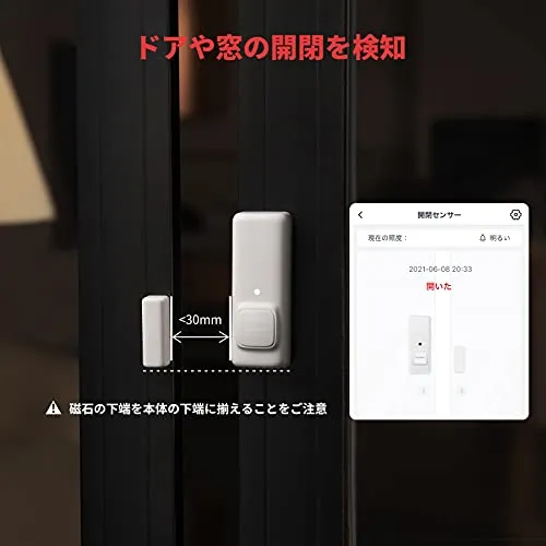 【SwitchBot開閉センサー】 SwitchBot開閉センサーをドアや窓に貼るだけでドアや窓の開閉状況を検知可能。24時間にスマホから確認できます。モーションセンサー搭載で、外出モードと帰宅モードを認識可能。ドアを開ける・閉める瞬間に家電をオン・オフ。