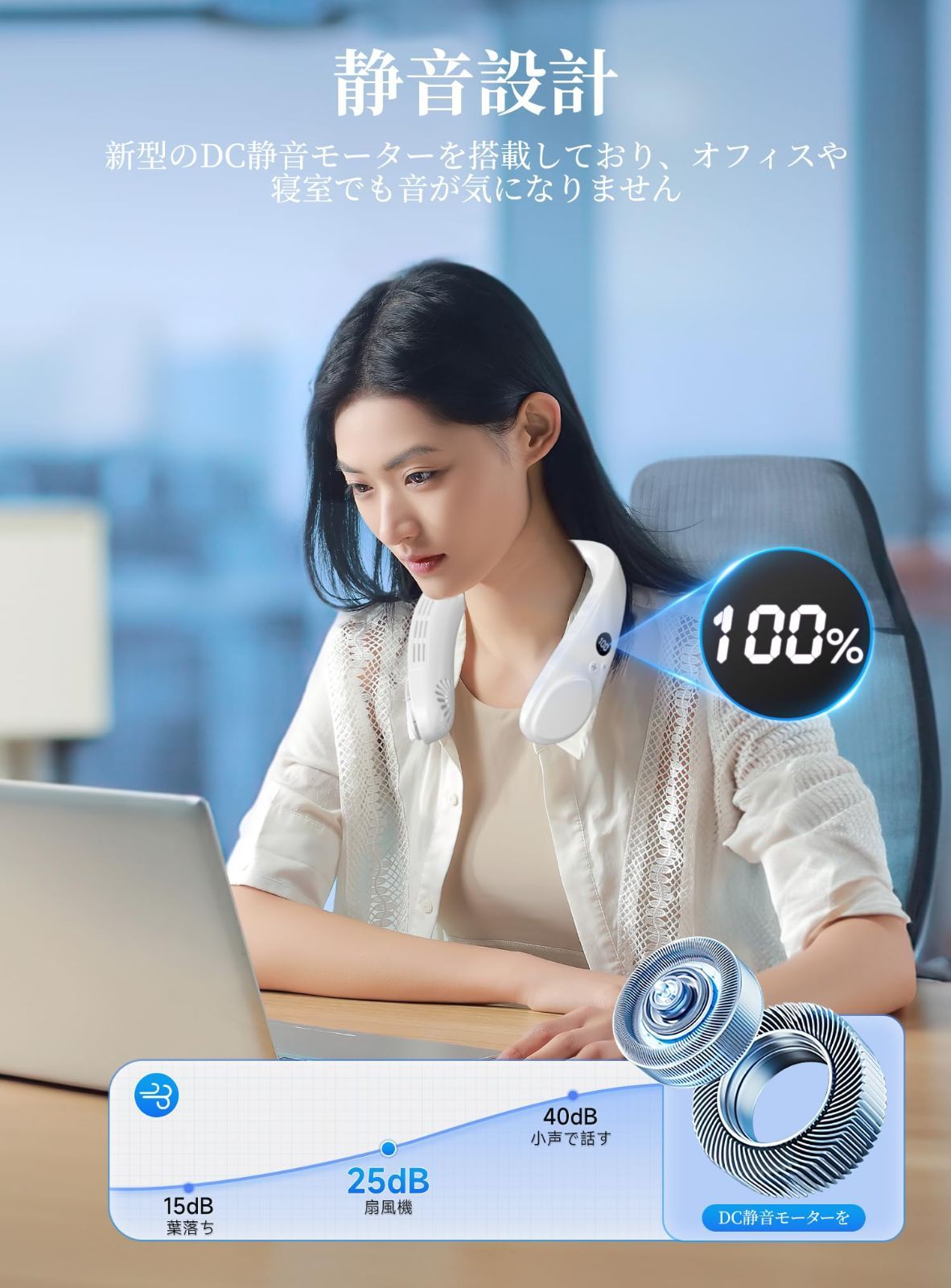 【羽根なし設計・静音設計】 最新の羽根なし設計を採用し、髪の毛や衣服が巻き込まれる心配が一切ありません。エアロダイナミック風道設計により、滑らかで均一な風を提供し、快適な涼しさを実現。さらに、最新のDC静音モーターを搭載し、動作音はわずか20dB以下。図書館のような静かな環境でも周囲に気兼ねなくご利用いただけます。カフェやオフィス、自宅でのリラックスタイムにも最適です ブランド YONA 色 ホワイト 電動ファンのデザイン ウェアラブルファン 電源