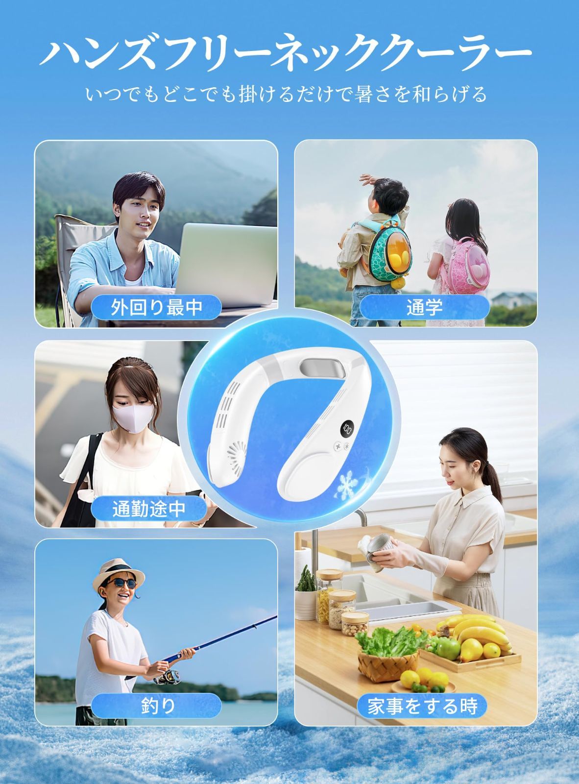 【首掛け設計で負担ゼロ・両手解放】わずか350gの軽量設計で、人間工学に基づいた曲線が首や肩への負担を軽減。ネックファン調整可能な弾性アームで、男女問わずあらゆる体型にフィット。羽根なし設計で髪の毛が巻き込まれる心配もなく、両手を自由に使えるため、キッチン、オフィス、スポーツ、アウトドアなど多様なシーンで活躍します。
