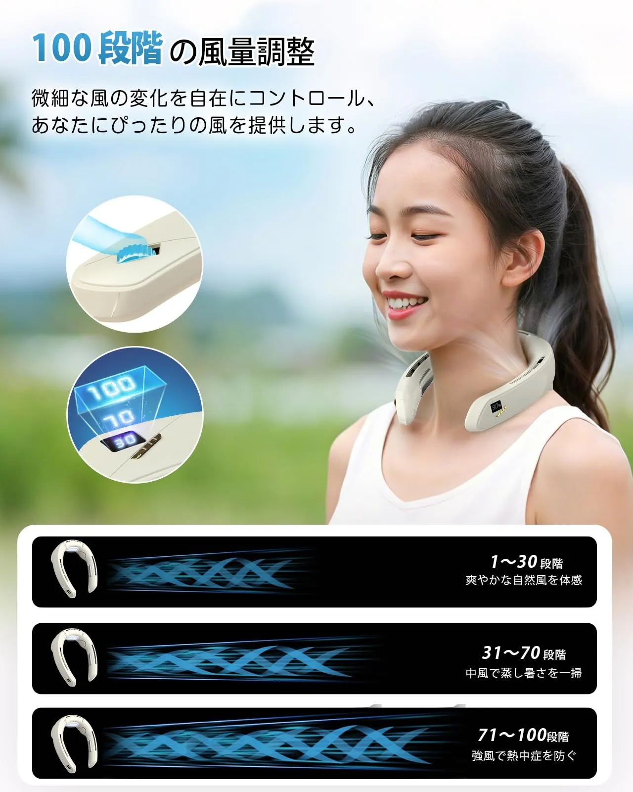 【超強力送風&100段階風量調節】このネックファンは、業界トップクラスの7500r/m高速回転モーターを採用。従来の首掛け扇風機 ネッククーラーと比べて集風効率99%向上を実現し、強力な風を長時間持続!さらに、右側のダイヤルを回すだけで1~100段階まで細かく風量を調節可能。あらゆるシーンにピッタリ合わせられます。夏の熱中症対策やアウトドア、通勤・通学にも最適な一台です!