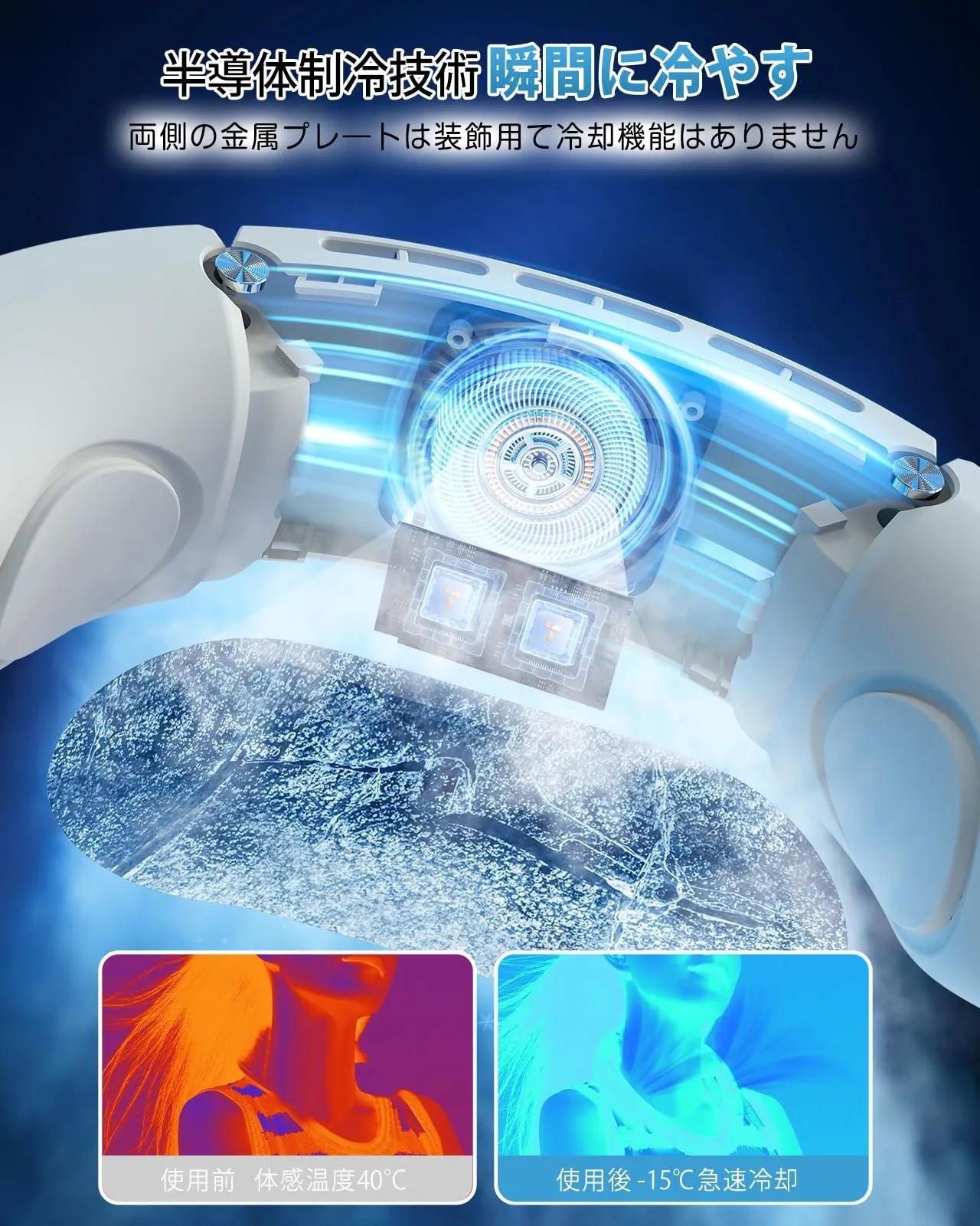 【2025年モデル・瞬冷ネッククーラー】半導体冷却技術を搭載した次世代ネッククーラー 冷却プレートが登場!首の後ろには市販の接触涼感金属プレートではなく、ペルチェ素子付き 冷却プレートであり、首元を瞬時にクールダウン!わずか2秒でひんやり体感でき、体感温度を最大-15℃もダウン。従来の首掛け扇風機を超える30%以上の冷却力で、灼熱の夏も快適に!両側の金属プレートはペルチェ素子ではないが接触冷感可能で肌に触れるとひんやり感を提供します。
