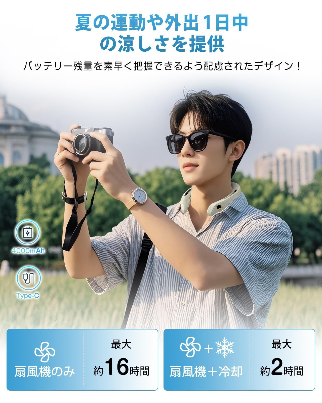 【1日持ちの4000mAh大容量バッテリー】初代モデル首掛けクーラー比電力効率10%向上!送風モード時は最大16時間の長時間駆動を実現(※冷却モード+100段階送風モード時は2~4時間)。Type-C急速充電対応で、PCや車載USBからも充電可能。LEDディスプレイ搭載で残量と風量を常に確認でき、急な電池切れの心配なし!朝から夜まで、快適な涼しさを持続させます。