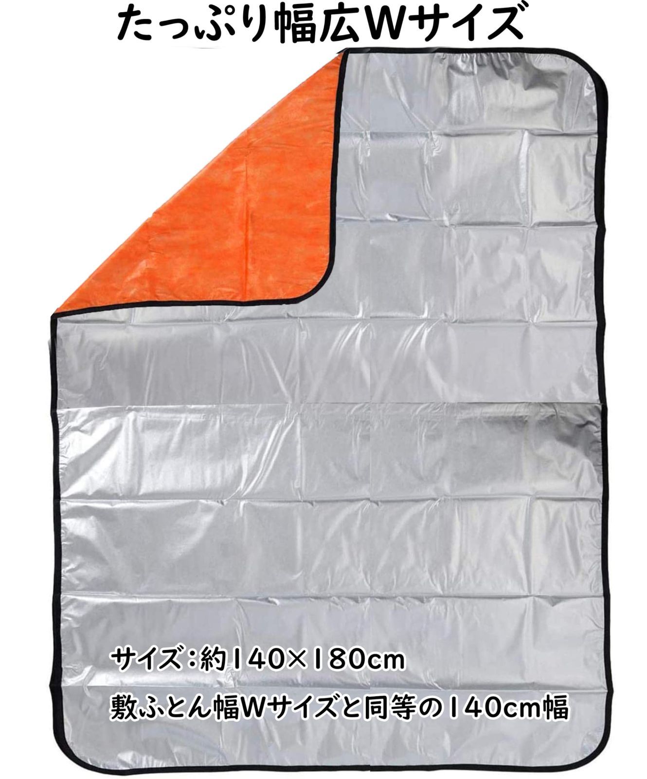 サイズ:約140×180cm、敷ふとん幅Wサイズと同等の140cm幅(折り畳み時サイズ:25 × 30 × 2cm コンパクト ちょうどA4ファイルサイズです。) 素材:ポリエチレン+アルミ+ポリエチレン+ポリプロピレン不織布の特殊4層構造、 重量:軽量 約200g 、 大きめサイズでたっぷり使えるWサイズの登場。