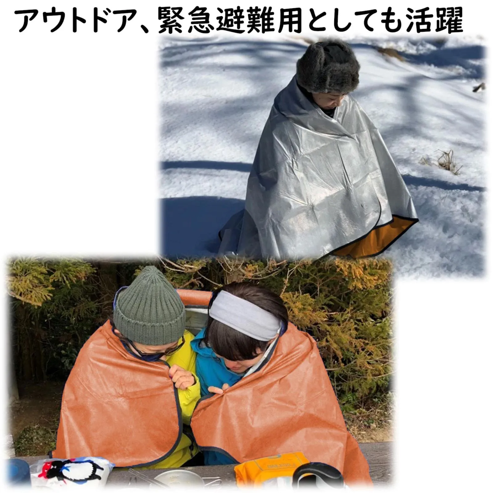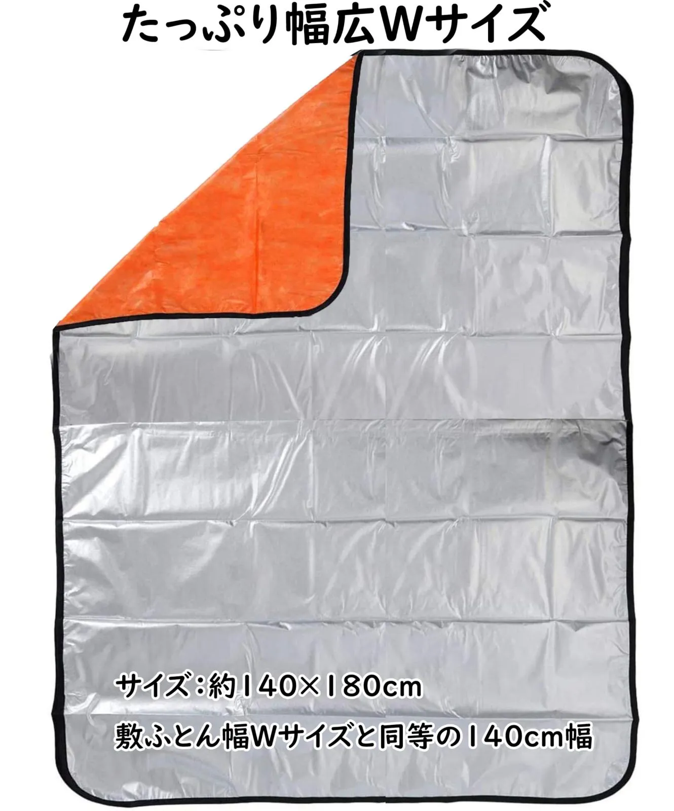 広げると 140 × 180 cmサイズになるWサイズの登場。毛布のように被ったり、 ベッドやマット、布団の下に敷いたりと様々な使い方が可能。 熱を逃がさない4層構造なのでいざという時にはサッと広げて 寒さをしのぐことができ大変便利。電気を使わずエコでポカポカ。 毛布として、キャンプ等テント内で寝袋インナーやテントシートの代わりとして、 体温を逃がさない。
