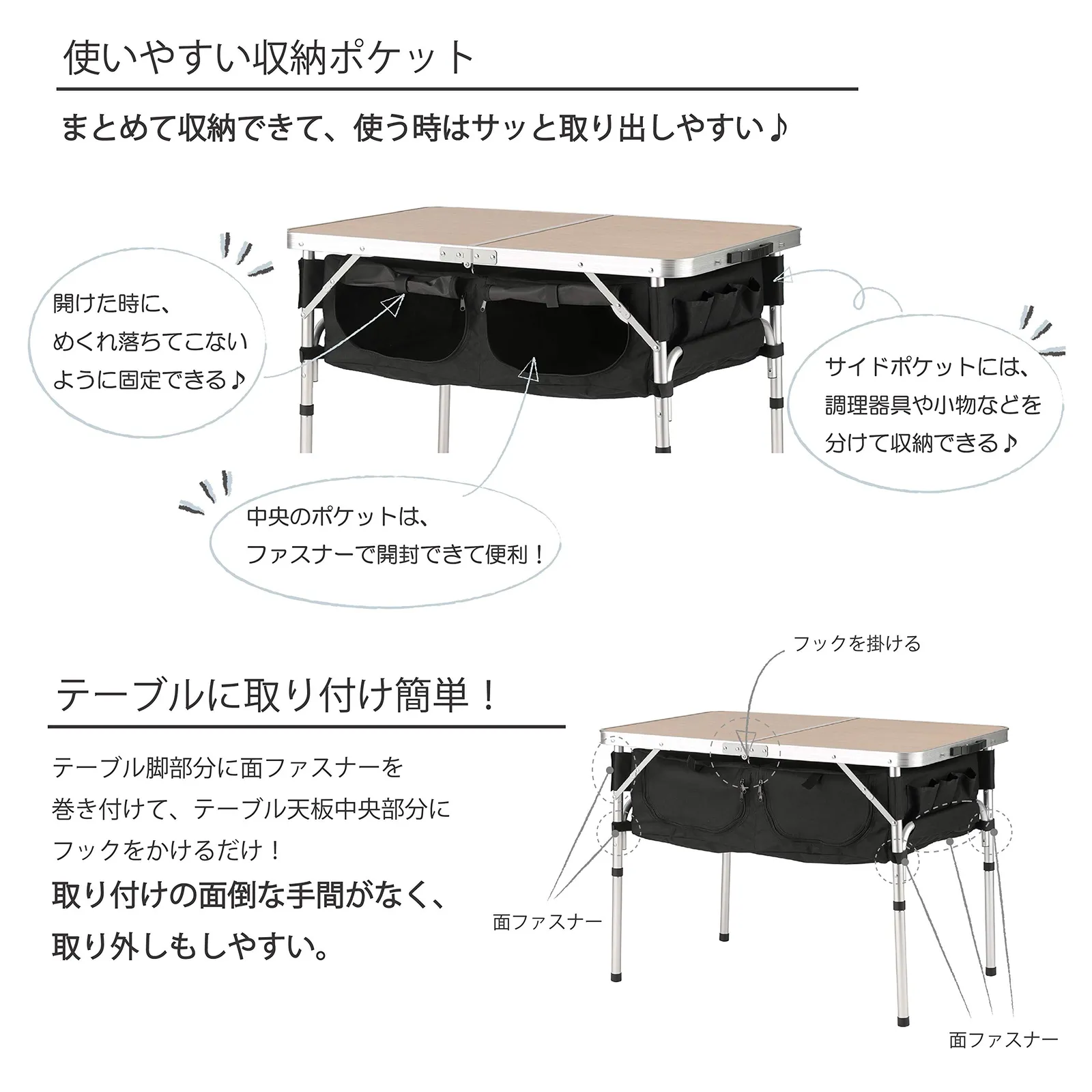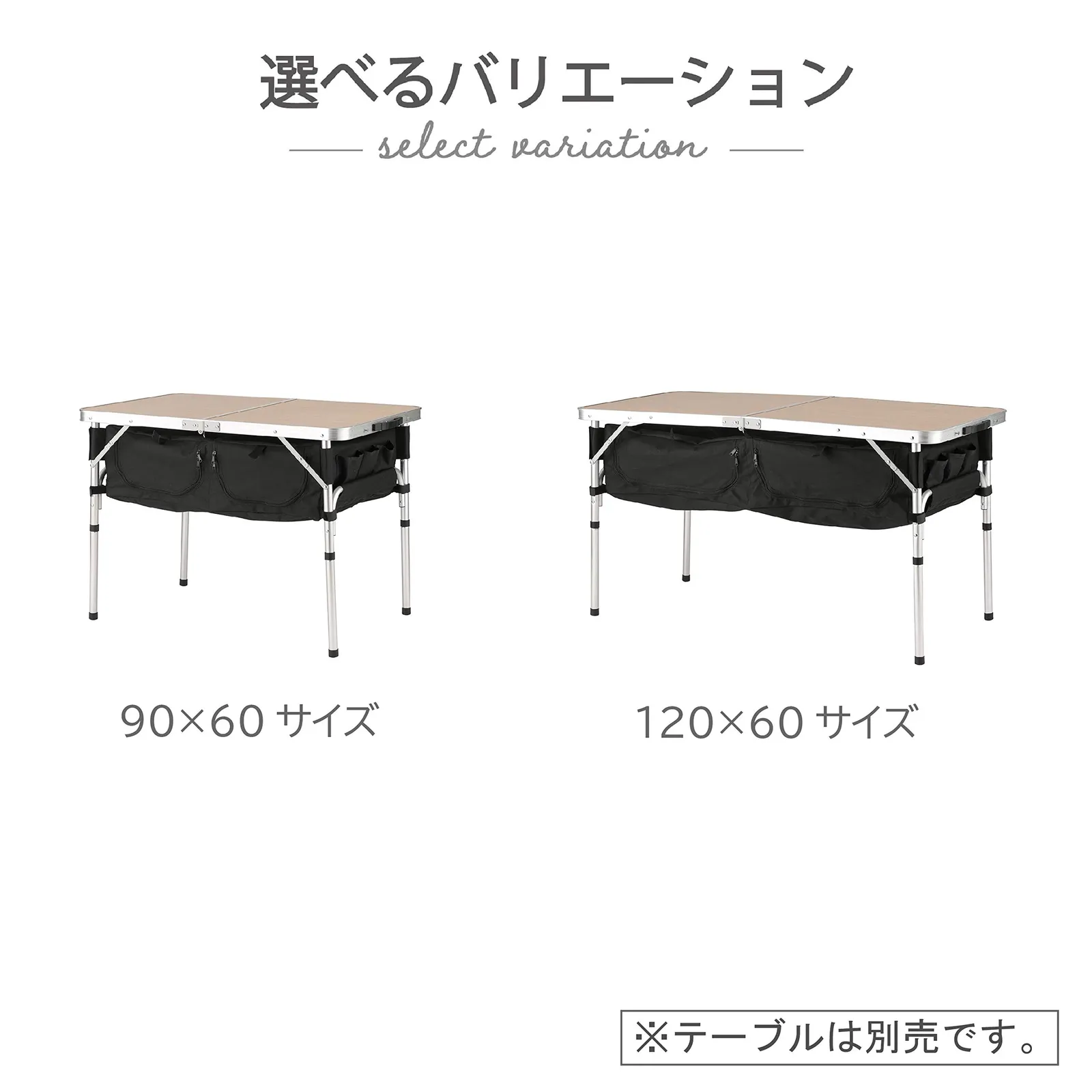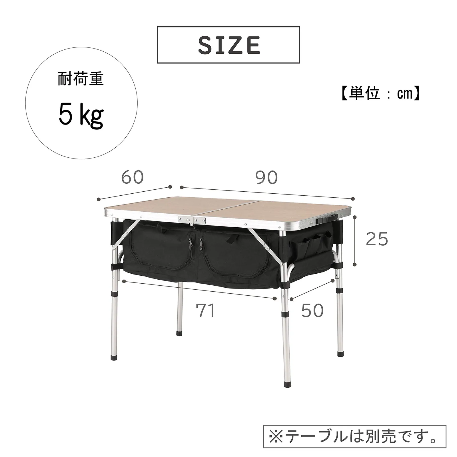 90×60サイズのテーブル(別売)と組み合わせて使用するストレージシェルフです。テーブルの天板下のスペースに、散らかりやすい調理器具や小物などを収納できて便利!限られた空間を有効活用できるので、テーブルを広々と使うことができる♪材質:生地:400Dポリエステル 接続部:スチール耐荷重:5kg