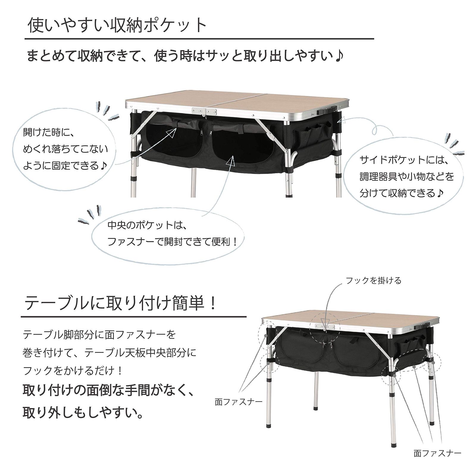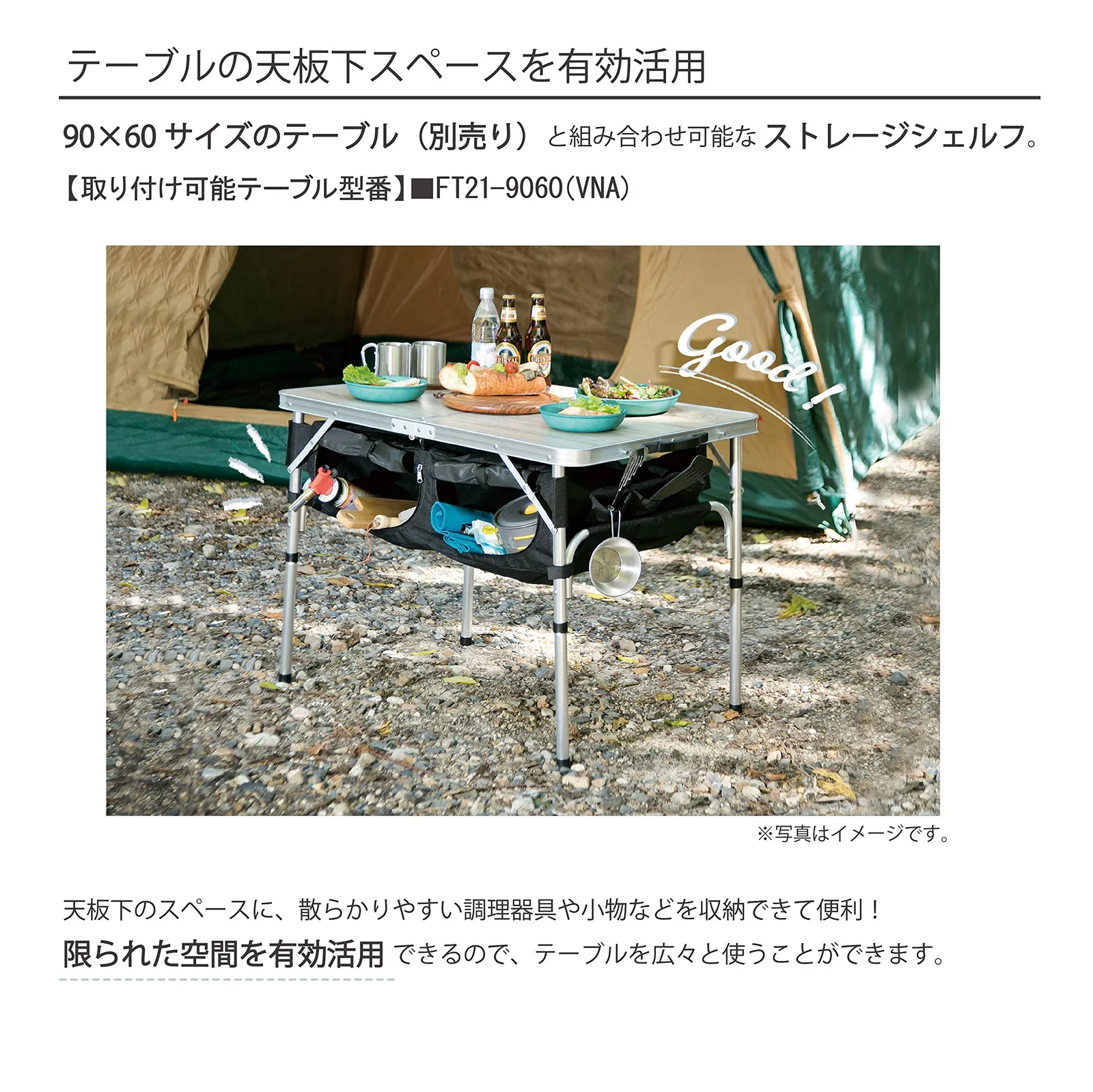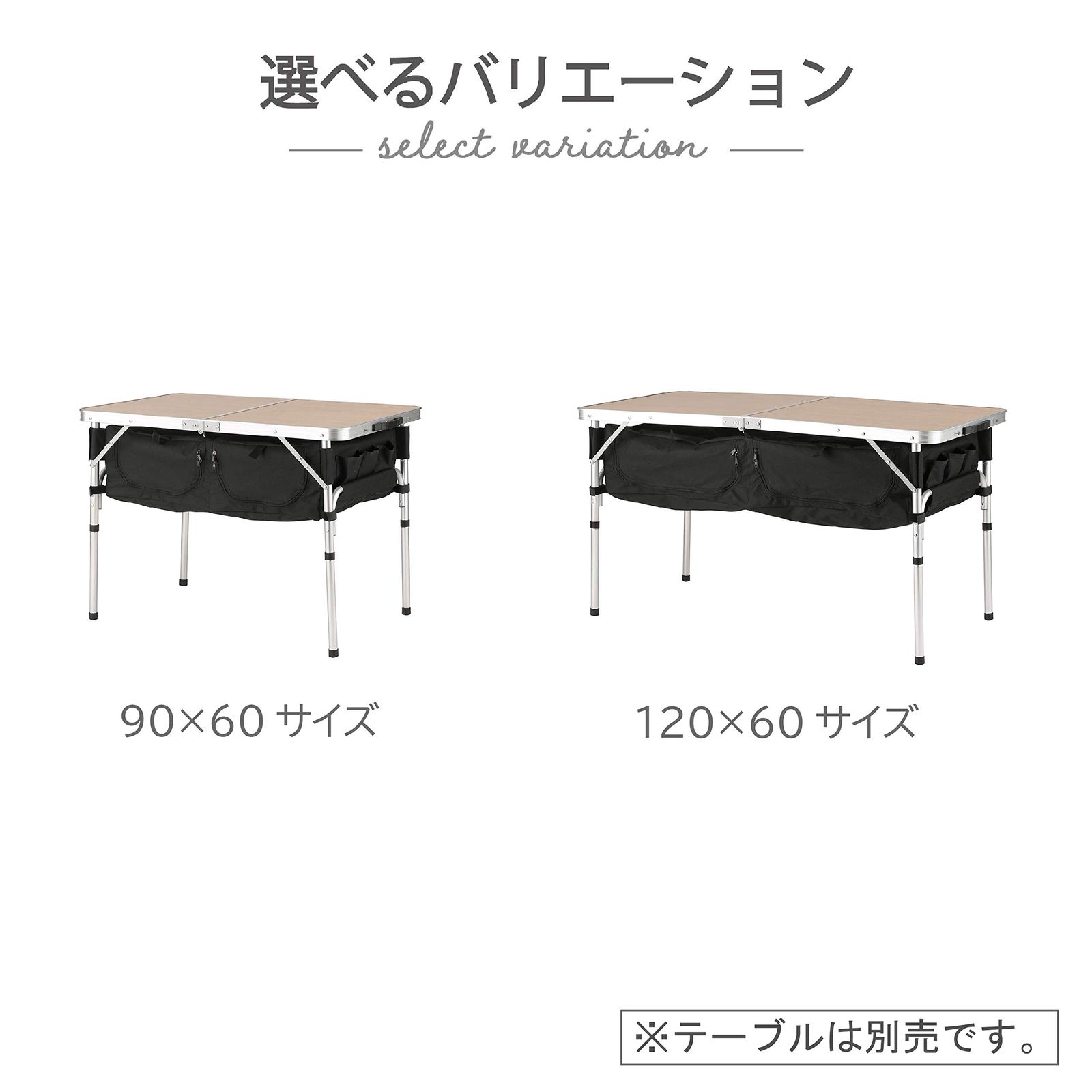 90×60サイズのテーブル(別売)と組み合わせて使用するストレージシェルフです。テーブルの天板下のスペースに、散らかりやすい調理器具や小物などを収納できて便利!限られた空間を有効活用できるので、テーブルを広々と使うことができる♪材質:生地:400Dポリエステル 接続部:スチール耐荷重:5kg