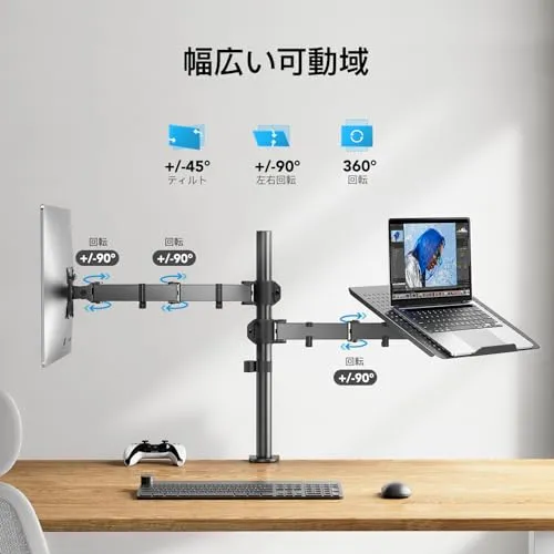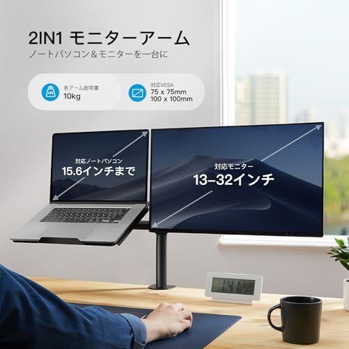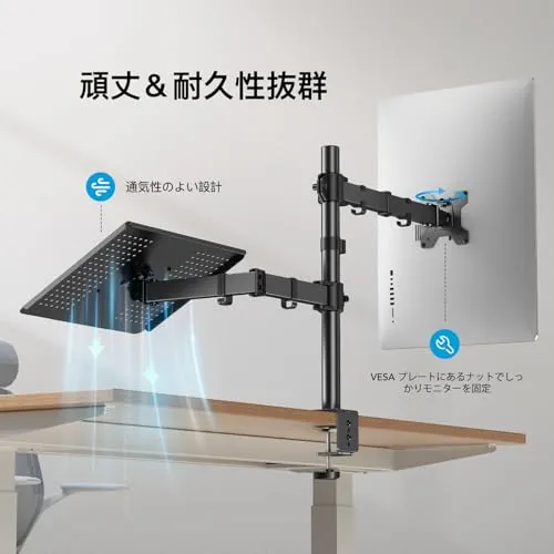【2in1モニターアーム】PCモニターアームとノートパソコンスタンドが融合されていて、ディスプレイやノートパソコンがより快適に使えます。PCモニターとノートパソコンという組み合わせになってますが、2枚PCモニターをつけることも可能です。PC&ノートパソコンのデュアル環境の方にお勧めです。