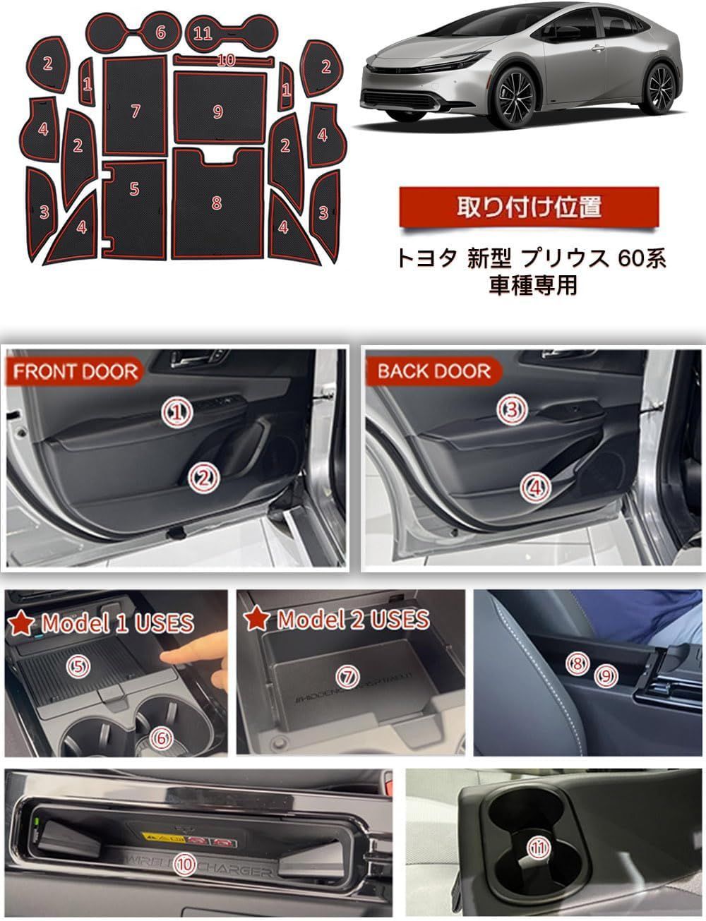 トヨタ 新型 プリウス 60系 5代目 ZVW60 MXWH60 レッド インテリア ラバーマット ドアポケットマット 滑り止めシート 19枚セット