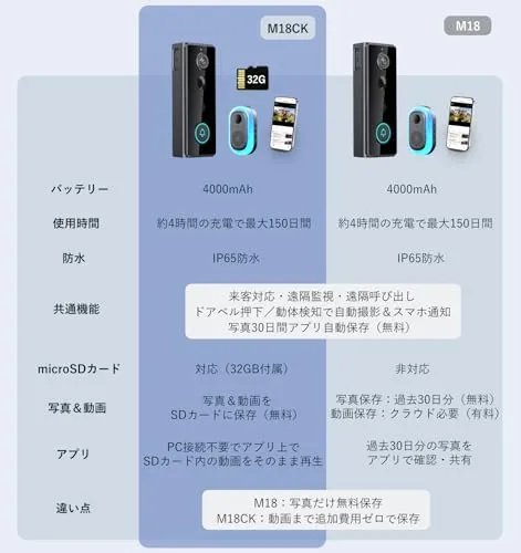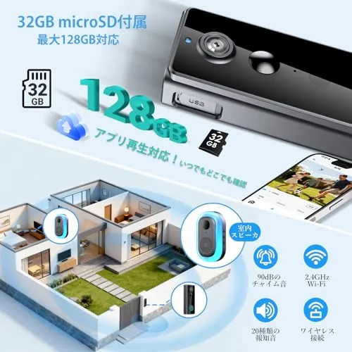 【動体検知・自動録画µSDカード付・アプリで動画再生】自動録画機能付きの玄関カメラはPIRモーションによる警報通知機能を備えており、来訪者のボダン押下や人の動きを検知すると、自動で録画、スマホに通知します。留守中や外出時、夜間など、カメラの前に誰もいない状況でも重要な出来事を見逃すことなく確実に記録でき、付属の32GB microSDカードに映像を保存し、スマホから動画データをいつでも確認可能。大切な映像を保存・管理できますので防犯カメラとしても活躍します。