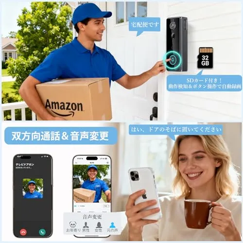 【LED暗視&広角1080p高解像度・音声変更】1080P高解像度160広角レンズで、見たい場所も3倍ズームでき、来訪者の表情などを確認できる見守りカメラ。また、暗視機能によって、訪問者のボタン押下でLEDライトが自動点灯し、夜間でも顔をはっきり確認できます。音声変更機能も搭?し、男性・女性・お年寄りなど複数の音声に変更させることができ、不審者に対して家の中に男性がいると錯覚させることで、不測の事態を未然に防ぐことができます。単に視認性を高めるだけでなく、防犯面でも効果を発揮する玄関カメラです。