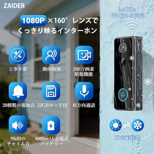D★ZAIDER インターホン 工事不要 ワイヤレス ドアホン スマホ連動 防犯カメラ 【1枚多役・遠隔監視|来客対応|動体検知|自動録画】 テレビドアホンカメラー付き 2.4GHz無線 双方向通話 IP65防水 暗視 1080P USB充電式 4000mAh