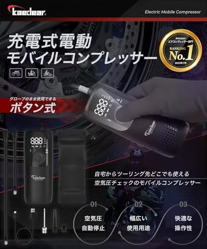 【モバイルコンプレサー】 空気圧調整が自宅やツーリング先で手軽に行える充電式電動エアーポンプ。車のタイヤの空気圧調整や自転車の空気入れとしてもご使用頂けます。物理ボタンは作業中にグローブをしたまま空気圧調整が可能。指定した空気圧まで自動的に充填します。※注意事項※ ?ご使用の際は85db程の音が発生します。使用する環境によって反響する事があり、うるさく感じる事がございます。 ?本製品は空気を圧縮し排出する為、高温になります。使用には問題はございません。また長時間の連続使用は控えて頂きホース等の高温になりやすい箇所は直接お手を触れないようご注意ください。 ?ホースが適切についていない場合、ホース内部に異物がある場合誤作動の原因となる場合がございます。誤作動や不具合、違和感を感じた場合は本体-ボタンを5秒以上長押しして頂きリセットをして頂く事で改善される場合がございます。