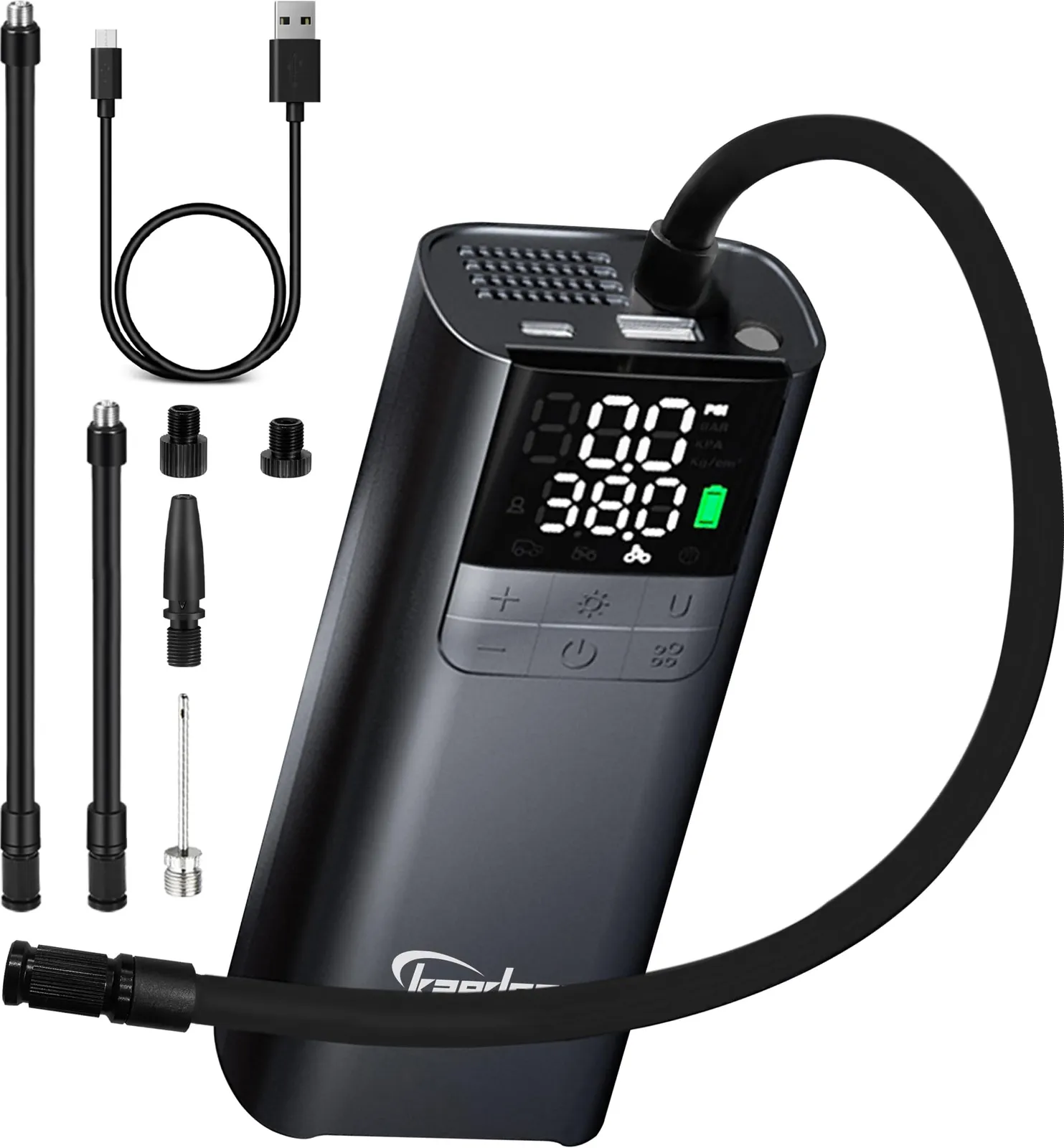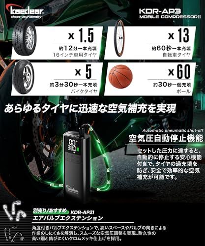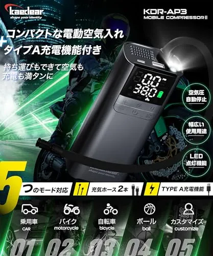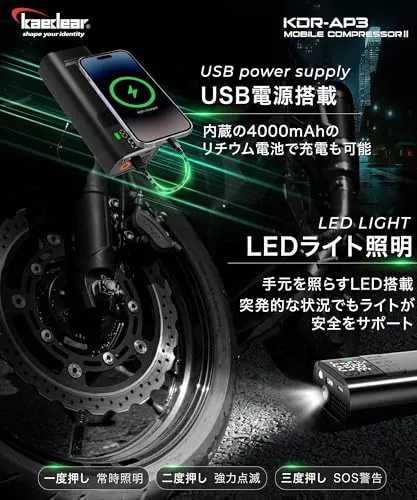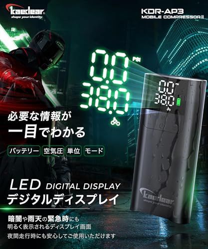 D★Kaedear(カエディア) バイク 空気入れ 電動 エアーポンプ 電動空気入れ 充電式 USB電源 スマートエアポンプ 2000mah×2 合計4000mah/14.8wha 150PSI typeC オートバイ 自転車 車 モバイルコンプレッサー KD